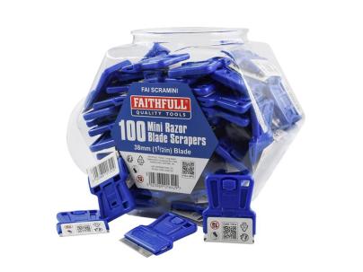 £62.39 inc VAT The Faithfull Mini Scrapers Full Display Unit contains 100 mini scrapers, neatly presented in a reusable plastic display jar – ideal for trade counters, workshops, or retail environments.The Faithfull Mini Scrapers are designed for scraping and cleaning hard surfaces, including paint, spills, ovens, hobs, and sticky labels. Each scraper comes fitted with a 60 carbon steel blade and features a durable ABS plastic body for reliable performance.Specifications:Length: 45mmWidth: 40mmBlade Width: 38mmMaterial: ABS plasticIncluded: One blade per scraperReplacement blade code: FAICRARAZBL Pack of 10. Add to Basket Quantity