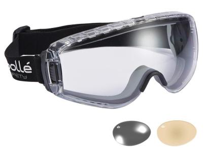 • Bolle PILOT Ventilated Safety Goggles have an ultra-flexible frame for adaptability and excellent comfort. An adjustable strap ensures a secure fit, and the goggles will fit over prescription spectacles. The lens has an anti-scratch and anti-fog PLATINUM® Coating. Protects against medium energy impacts (120m/s).