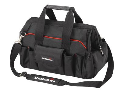 • The Hultafors Craftsman's Open Wide Tool Carrier opens wide and stays open thanks to a frame, giving you easy access to your tools while you work. It has a large compartment with multiple tool holders and two zippered pockets for small items and bits. It closes easily with a zipper to protect your tools. The zippers are made of nylon with durable metal pullers that are easy to grip, even with gloves on. Made from extremely durable ballistic polyester, 1680 Denier which gives it maximum wear resistance and longevity. The rubber handles provide a comfortable grip. It also comes with an adjustable shoulder strap.
